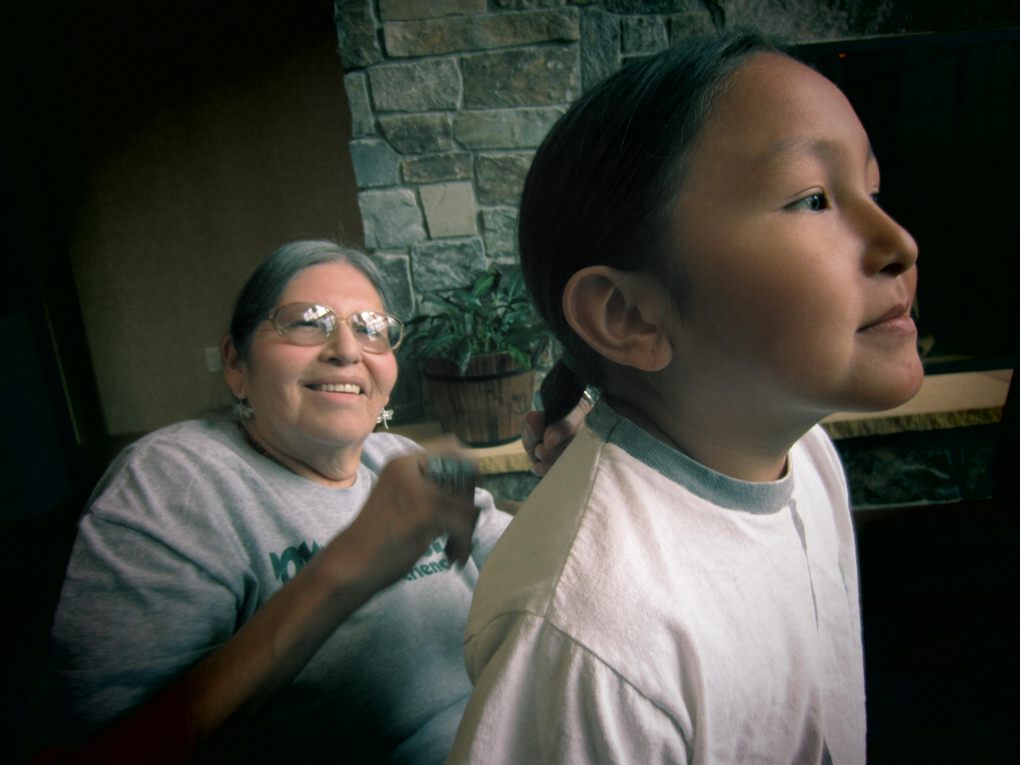 Lakota Elder Jace DeCory braiding her grandson's hair in Spearfish, South Dakota :)