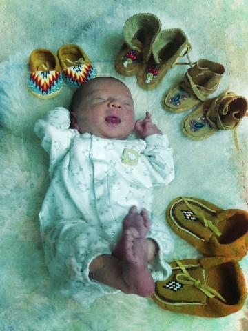 Tlicho Elder Rosa Mantla showing us all how to name parts of the body in Tlicho using our baby boy as a model, Edzazii Van Camp :)